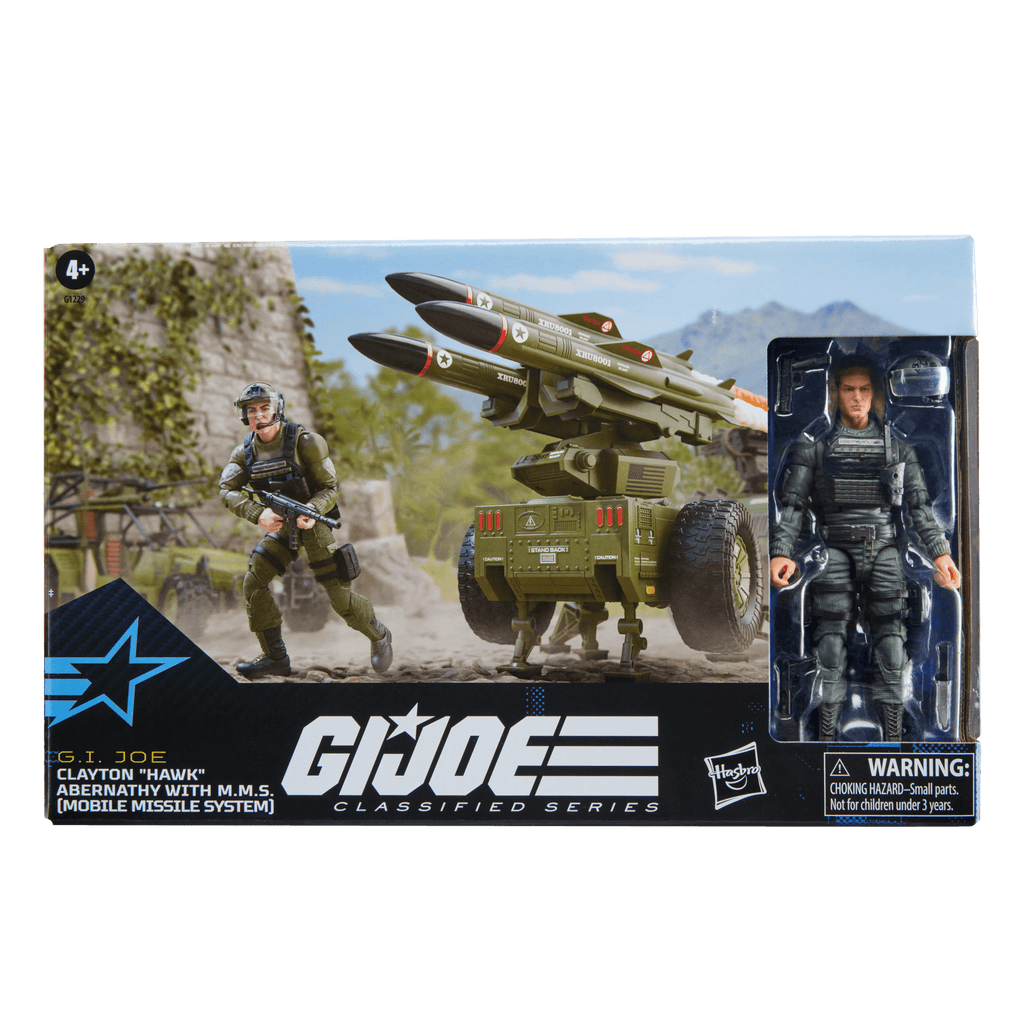 Nueva incorporación a la línea GI Joe Classified Series, Clayton "Hawk" Abernathy con su Sistema Móvil de Misiles (MMS) llega listo para la aventura, con múltiples puntos de articulación para una gran variedad de poses. Esta figura de Clayton "Hawk" Abernathy incluye 10 accesorios inspirados en el personaje, como cuchillo, casco con visera, funda desmontable y accesorios de armas. El MMS incluye 15 piezas, entre ellas 3 misiles, base de misiles elevable y giratoria, tapa del panel de control desmontable, pata estabilizadora plegable, patas de apoyo plegables, ruedas giratorias, enganche de remolque ajustable y 6 efectos de explosión.
