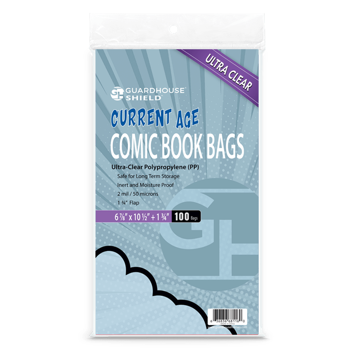 Admite cómics actuales de tamaño aproximado de 6 5/8 x 10,5 pulgadas. La mayoría de los cómics publicados desde la década de 1990 son compatibles con la bolsa Guardhouse Shield.